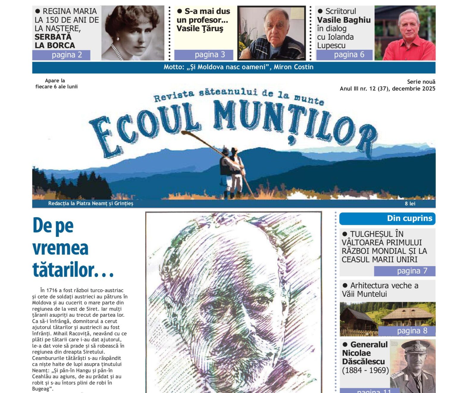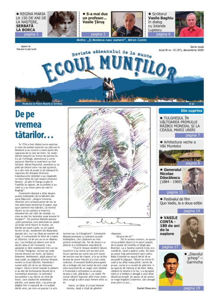 Se încheie un al treilea an pentru revista noastră. Numărul din decembrie este unul divers şi, spunem noi, valoros şi plăcut. Valoarea este dată şi de cei care scriu şi în acest număr sunt autori plini de erudiţie şi acribie. Începem cu junioarele noastre: Maya Bicăjanu ne oferă o prezentare şcolărească a semnificaţiei zilei de 1 Decembrie, iar Ioana Bortişcă a realizat o scurtă descriere a celui de-al doilea război mondial, textul fiind oferit şi în engleză. Sfaturile duhovniceşti aparţin preotului Gheorghiţă Anisiea, iar un eseu etnografic îndelung lucrat ne-a trimis învăţătorul Ilie Alexandru. Interviurile ediţiei sunt realizate cu un scriitor nemţean, un antrenor de fotbal şi un patron de tabără pentru copii, iar portretul este al unui şofer profesionist pasionat de fotografie. Este comemorat Aurel Dumitraşcu şi Samuil Mârza (Iolanda Lupescu), continuăm istoria generalului Dăscălescu, iar Emanuel Bălan ne prezintă începuturile de acum 100 de ani ale ideii „Catedralei neamului”.