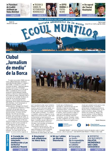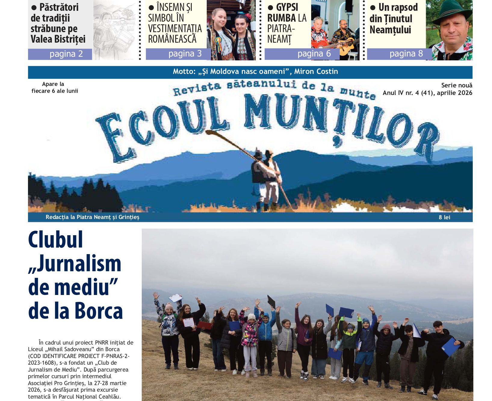 La numărul 41, „Ecoul Munţilor” se prezintă cu un conţinut divers şi interesant, un caleidoscop incitant, 35 de articole şi 18 autori. În prim plan, doamna Iolanda Lupescu, care a intervievat (o discuţie deosebită cu universitarul Dan Dumitriu), a cercetat, a recenzat. Nu lipseşte preotul Gheorghiţă Anisiea, istorie şi cuvânt duhovnicesc, domnul Ilie Alexandru, ce ne apare precum vinul, cu cât se învecheşte cu atât este mai bun. Fireşte, Maya Bicăjanu ce a scris şi desenat şi, la fel, un debut, Roxana Moldovanu, clasa a VIII-a, sau Teodora Ungureanu, tot clasa a VIII-a. Revin doamnele profesoare Gabriela Vanda Cortez şi Gabriela Chiorbeja. Nu lipsesc istoricii noştri: Ana şi Andrei Nica şi Emanuel Bălan. Mulţumim doamnei profesoare Elena Aflorei pentru un nou articol interesant. De asemenea, Marius Coşerariu, Lăcrămioara Pop sau Corina Cruşitu sunt alături de noi. Sport, poezie, eseuri, anecdote, presă veche, biografii, istorie şi etnografie. O mică frescă, sufet şi culori frumoase.