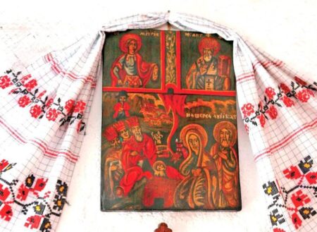 Cinstitul locaș de rugăciune este străjuit la intrare de clopotnița zveltă și de Monumentul Eroilor comunei Grințieș.