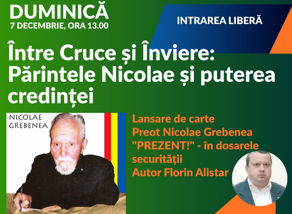 Duminică, 7 decembrie, ora 13.00, vă invităm la un eveniment de suflet la Biserica Toma Cozma: lansarea volumului „Preot Nicolae Grebenea – PREZENT! În dosarele securității”, semnat de Florin Alistar.